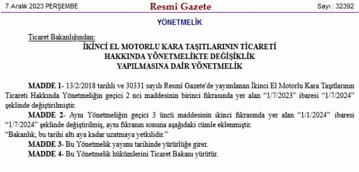 İkinci el araçların, sıfır fiyatlarından yüksek fiyatla satışa çıkarılmasının yasaklanmasına ilişkin yönetmelik Ticaret Bakanlığı’nca 6 ay daha...