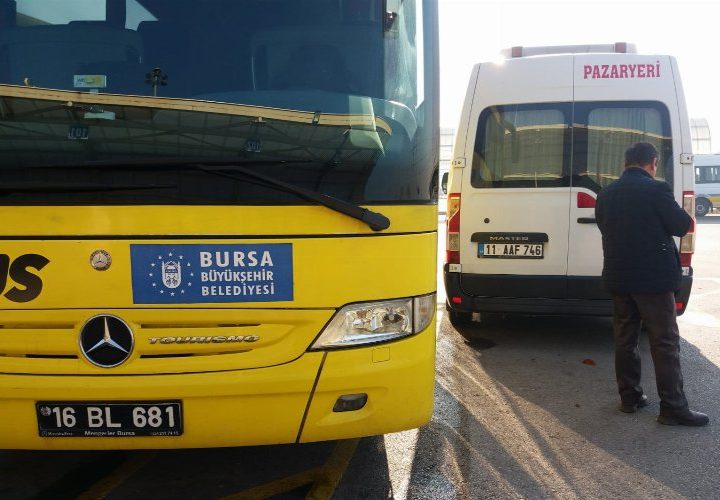 Bursa Şehirlerarası Otobüs Terminali’nde yaşanan kazada perondan çıkmaya çalışan Burulaş’a ait otobüs yan peronda yolcu bekleyen minibüse...