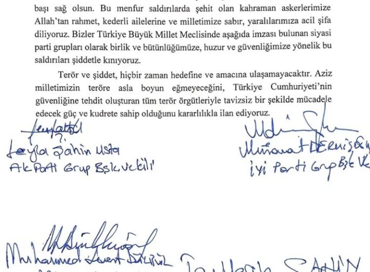 TBMM’de AK Parti, MHP, İYİ Parti ve Saadet Partisinin imzaladığı bildiride PKK terör örgütünün saldırıları kınanarak, “Terör...