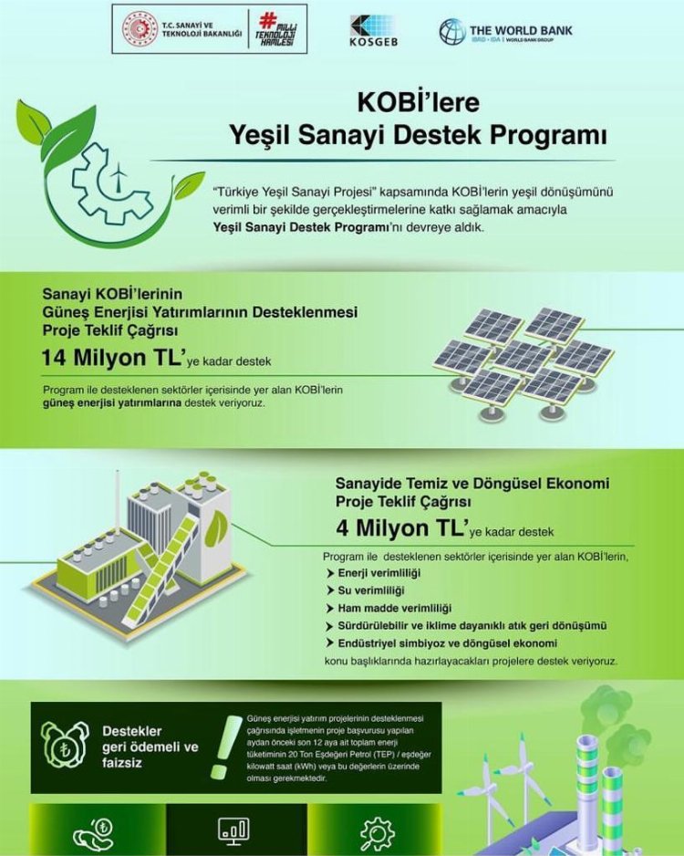 KOSGEB tarafından İmalatçı KOBİ’lerin yeşil dönüşüm faaliyetlerine yönelik geri ödemeli destek verileceğini kaydeden Tunç, “Söz konusu destek ile yenilenebilir enerji, kaynak verimliliği, atık yönetimi, döngüsel ekonomi vb. tematik alanlarda sanayi KOBİ’leri tarafından gerçekleştirilecek faaliyetler desteklenecektir. KOSGEB Yeşil Sanayi Destek Programı kapsamında: Sanayi KOBİ’lerinin Güneş Enerjisi Yatırımları ve Sanayide Temiz ve Döngüsel Ekonomi olmak üzere 2 Destek Programı açıklanmıştır. Sanayi KOBİ’lerinin Güneş Enerjisi Yatırımları Destek Programı kapsamında yüzde 60 destek oranı ile 14 milyon TL destek üst limiti olarak geri ödemeli faizsiz kredi desteği sağlanacaktır. Sanayide Temiz ve Döngüsel Ekonomi Destek Programı kapsamında ise yüzde 60 destek oranı ile 4 milyon TL destek üst limiti olarak geri ödemeli faizsiz kredi desteği sağlanacaktır. Bu geri ödemeli faizsiz kredi desteklerinin ödeme yöntemi projenin bitiş süresinden 1 yıl sonra ödeme başlayacak olup, 2 yıllık süre içerisinde 6’şar aylık 4 eşit taksitte geri ödeme yapılacaktır” dedi.