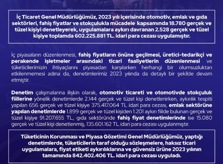 Ticaret Bakanlığı, otomotiv, emlak ve gıda sektörleri ile fahiş fiyat ve stokçuluk denetimleri kapsamında 18 bin 780...