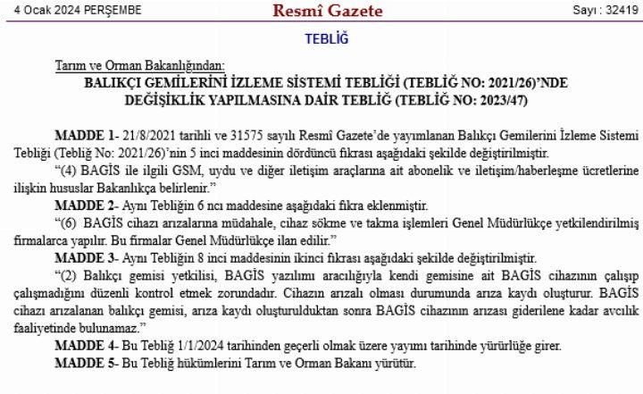 Balıkçı Gemilerini İzleme Sistemi (BAGİS) cihazı arızalanan gemiler, arıza giderilene kadar avcılık faaliyetinde bulunamayacak. ANKARA (İGFA) – ...