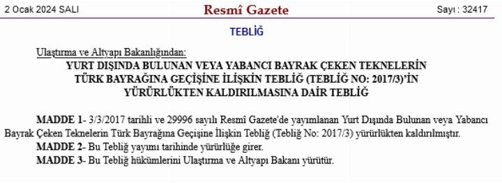 Teknelerdeki Türk Bayrağına ilişkin tebliğ bugünkü Resmi Gazete’de yayımlanan tebliğ ile yürürlükten kaldırıldı. ANKARA (İGFA) – Ulaştırma...
