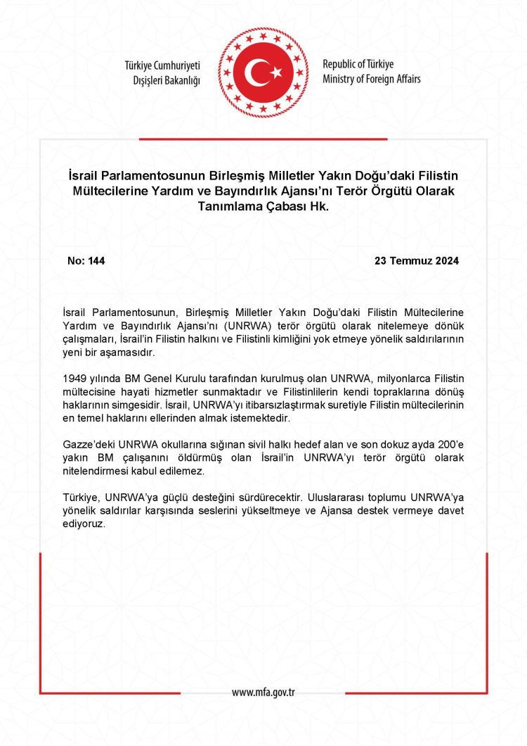 Dışişleri Bakanlığı, İsrail Parlamentosu’nun Birleşmiş Milletler Yakın Doğu’daki Filistin Mültecilerine Yardım ve Bayındırlık Ajansı’nı terör örgütü olarak tanımlama çabasına tepki göstedi.