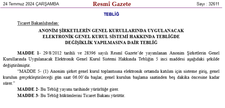 2012 yılındaki yayımlanan tebliğin 5’inci maddesi; “Anonim şirket genel kurul toplantısına elektronik ortamda katılım için sisteme giriş, genel kurulun gerçekleştirileceği gün saat 06.00’da başlar, genel kurulun başlama saatinden beş dakika öncesine kadar sürer.” şeklinde değiştirildi.