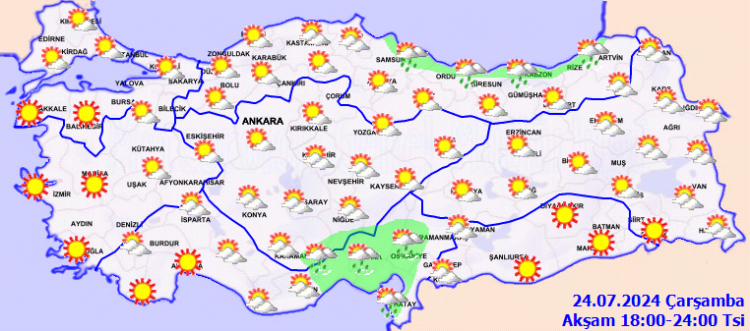 Meteoroloji Genel Müdürlüğü olarak yapılan değerlendirmelere göre: Ülkemiz genelinin parçalı, yer yer çok bulutlu, Marmara’nın doğusu, Orta Akdeniz’in iç kesimleri, Doğu Akdeniz, Batı Karadeniz, Orta ve Doğu Karadeniz kıyıları, İstanbul, Konya, Karaman, Niğde, Kayseri, Çankırı, Sivas, Artvin, Kars, Ardahan, Iğdır, Ağrı çevreleri ile Balıkesir’in kuzey, Erzurum ve Van’ın kuzey ve doğu kesimlerinin yerel olmak üzere sağanak ve gök gürültülü sağanak yağışlı geçeceği tahmin ediliyor. Yağışların Doğu Akdeniz’de yer yer kuvvetli olması bekleniyor.