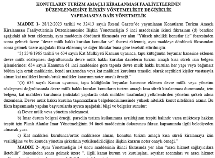 Resmi Gazete’de konutların turizm amaçlı kiralanması faaliyetlerinin düzenlenmesine ilişkin yönetmelikte değişiklik yapılmasına dair yönetmelik yayımlandı. ANKARA (İGFA)...