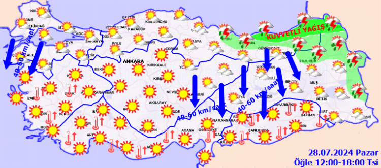 Türkiye’nin kuzeydoğu kesimlerinde parçalı bulutlu, Doğu Karadeniz kıyılarında yerel sağanak yağış bekleniyor. Meteoroloji, Ege, Akdeniz ve Güneydoğu Anadolu’da sıcaklıkların 40 dereceyi geçmesi beklendiği uyarısında bulundu.