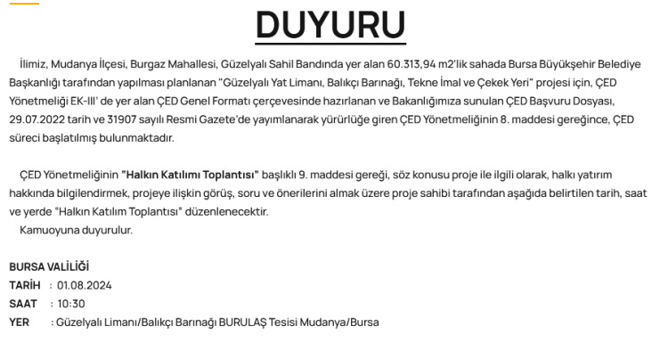 Bursa Büyükşehir Belediyesi, Mudanya’nın Güzelyalı Mahallesi’nde yer alan “Güzelyalı Yat Limanı, Balıkçı Barınağı, Tekne İmal ve Çekek Yeri” faaliyeti için Çevresel Etki Değerlendirmesi (ÇED) başvurusunda bulundu.