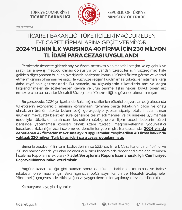 Ticaret Bakanlığı tüketicileri mağdur eden e-ticaret firmalarına geçit vermiyor. 2024 yılının ilk yarısında 40 firma için 230 milyon TL idari para cezası uygulandı.