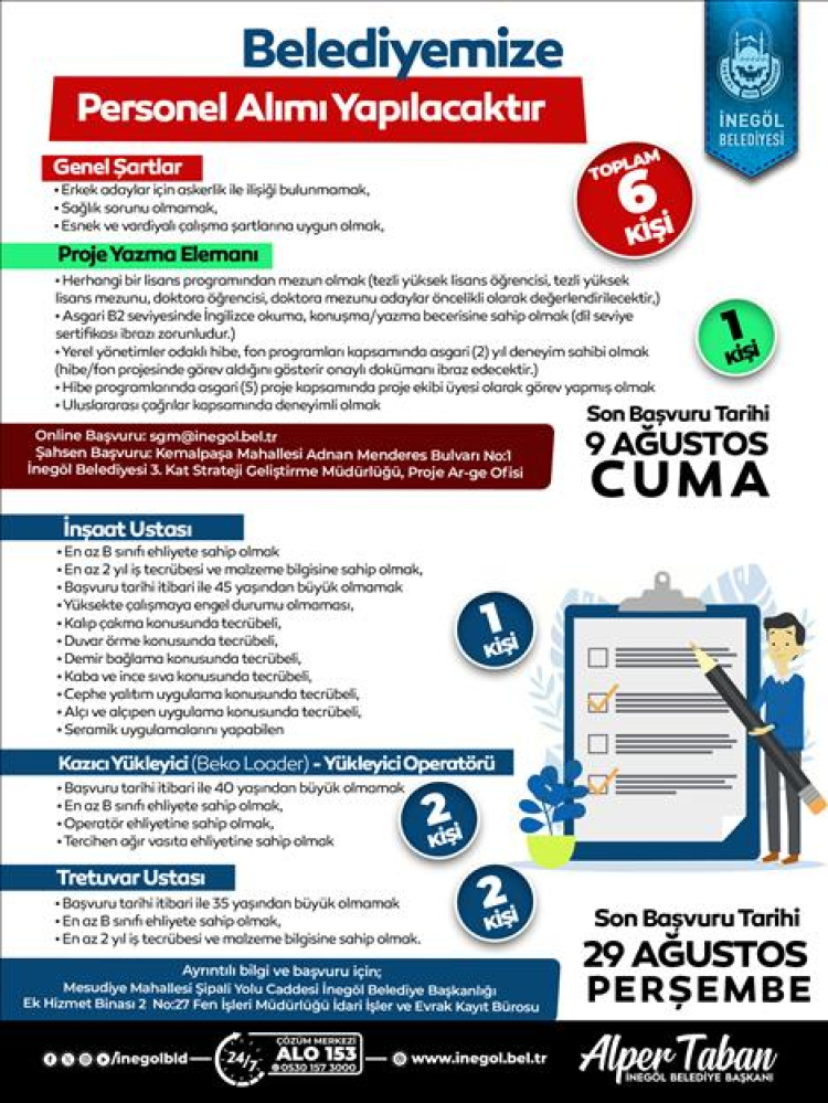 İnegöl Belediyesi, 4 ayrı alanda çalışmak üzere toplam 6 personel alımı yapılacağını duyurdu. Açıklanan personel alımı kapsamında; 1 Proje Yazma Elemanı, 1 İnşaat Ustası, 2 Kazıcı Yükleyici (Beko Loader)- Yükleyici Operatörü ve 2 Tretuvar Ustası alınacak.