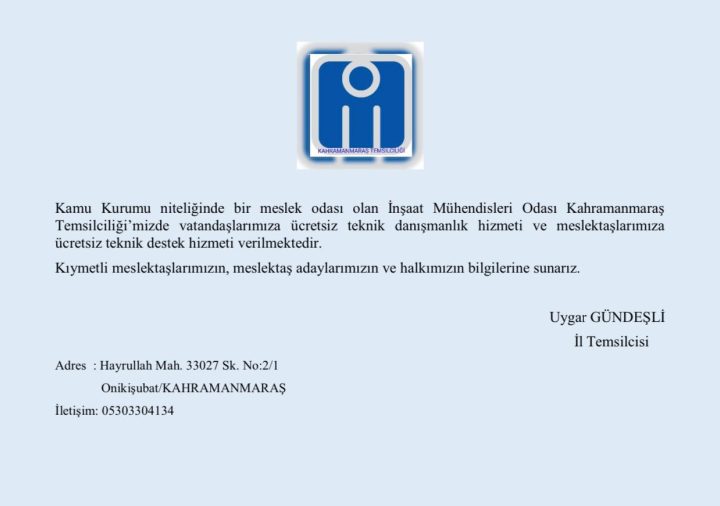 İnşaat Mühendisleri Odası Kahramanmaraş Temsilciliği’nde ücretsiz teknik danışmanlık hizmeti verileceği duyuruldu. Tural ŞAHBAZLI / KAHRAMANMARAŞ (İGFA) – ...