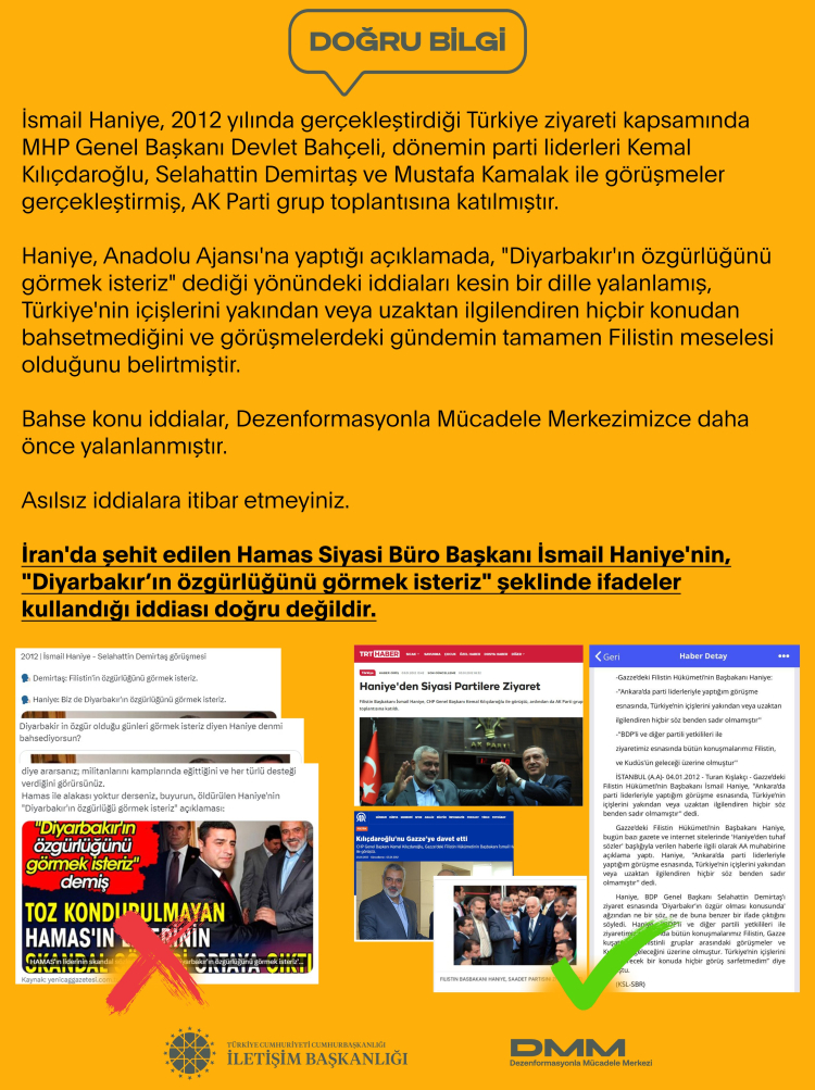 Yapılan açıklamada, “İsmail Haniye, 2012 yılında gerçekleştirdiği Türkiye ziyareti kapsamında MHP Genel Başkanı Devlet Bahçeli, dönemin parti liderleri Kemal Kılıçdaroğlu, Selahattin Demirtaş ve Mustafa Kamalak ile görüşmeler gerçekleştirmiş, AK Parti grup toplantısına katılmıştır. Haniye, Anadolu Ajansı’na yaptığı açıklamada, “Diyarbakır’ın özgürlüğünü görmek isteriz” dediği yönündeki iddiaları kesin bir dille yalanlamış, Türkiye’nin içişlerini yakından veya uzaktan ilgilendiren hiçbir konudan bahsetmediğini ve görüşmelerdeki gündemin tamamen Filistin meselesi olduğunu belirtmiştir. Bahse konu iddialar, Dezenformasyonla Mücadele Merkezimizce daha önce yalanlanmıştır. Asılsız iddialara itibar etmeyiniz” ifadeleri kullanıldı.