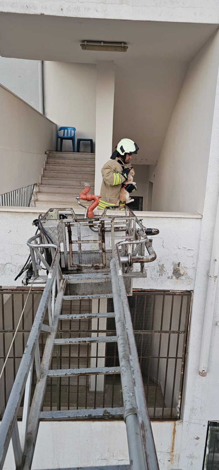 Mardin Büyükşehir Belediyesi itfaiye ekipleri, lisede mahsur kalan kediyi kurtardı.