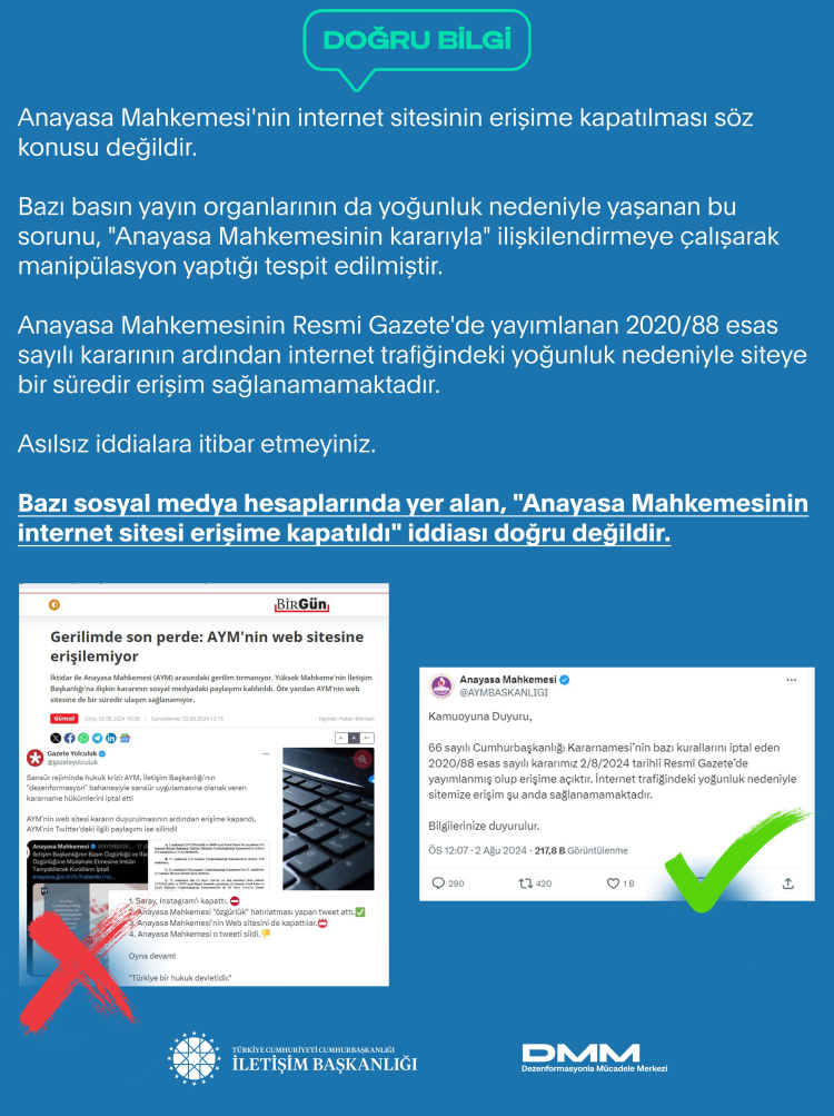 Bazı sosyal medya hesaplarında yer alan, “Anayasa Mahkemesinin internet sitesi erişime kapatıldı” iddiası doğru olmadığı belirtilen açıklamada, “Bazı basın yayın organlarının da yoğunluk nedeniyle yaşanan bu sorunu, “Anayasa Mahkemesinin kararıyla” ilişkilendirmeye çalışarak manipülasyon yaptığı tespit edilmiştir. Anayasa Mahkemesinin Resmi Gazete’de yayımlanan 2020/88 esas sayılı kararının ardından internet trafiğindeki yoğunluk nedeniyle siteye bir süredir erişim sağlanamamaktadır. Asılsız iddialara itibar etmeyiniz” ifadeleri yer aldı.