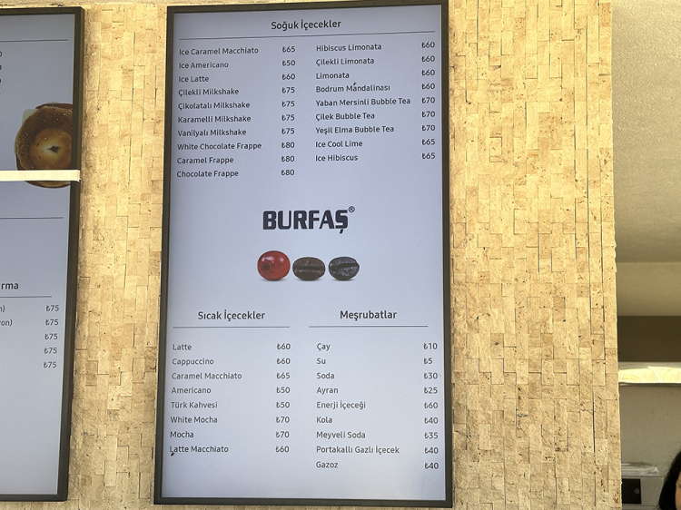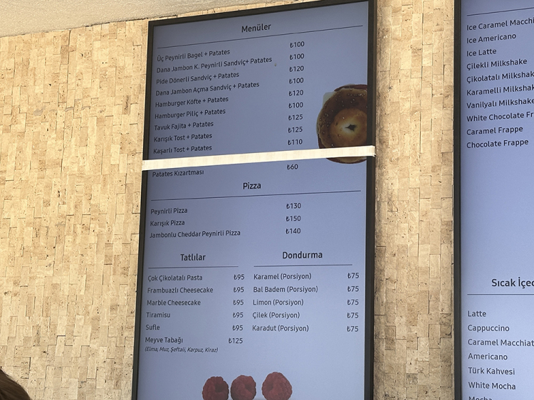 Limonata: 60 LiraIce Latte: 60 LiraÇay: 10 LiraSu: 5 LiraSoda: 30 LiraTürk kahvesi: 50 LiraPeynirli pizza: 130 LiraHamburger köfte+patates: 120 LiraPatates kızartması: 60 Lira