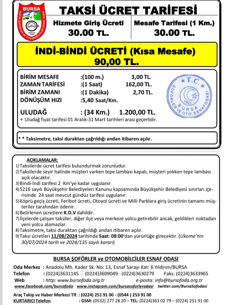 Bursa’da 11 Ağustos 2024 tarihinden itibaren geçerli olmak üzere taksi ücretlerine zam yapıldı. Yapılan zamlara göre indi-bindi fiyatı 70 liradan90 liraya, kilometre fiyatı ise 23 liradan 30 liraya yükseldi.