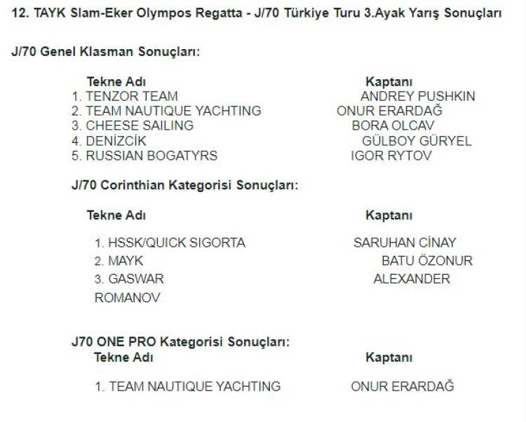 İSTANBUL (İGFA) – 12. TAYK Slam-Eker Olympos Regatta kapsamında yapılan J/70 sınıfı mücadelesi, 9 Ağustos ve 10 Ağustos’ta düzenlenen yarışlarla tamamlandı.
