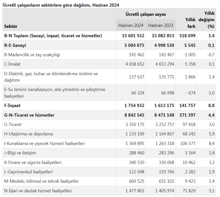 Ücretli çalışan sayısı bir önceki yılın aynı ayında 15 milyon 82 bin 853 kişi iken, 2024 yılı Haziran ayında 15 milyon 601 bin 552 kişi oldu. Ücretli çalışanların alt detaylarına bakıldığında; 2024 Haziran ayında ücretli çalışan sayısı yıllık olarak sanayi sektöründe yüzde 0,1 arttı, inşaat sektöründe yüzde 8,8 arttı ve ticaret-hizmet sektöründe yüzde 4,4 arttı.