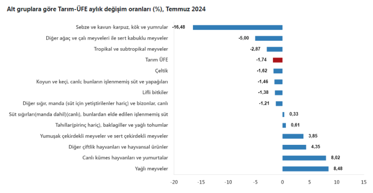 Ana gruplarda bir önceki aya göre, tek yıllık (uzun ömürlü olmayan) bitkisel ürünlerde yüzde 8,78 azalış, çok yıllık (uzun ömürlü) bitkisel ürünlerde yüzde 6,57 artış ve canlı hayvanlar ve hayvansal ürünlerde yüzde 0,12 azalış gerçekleşti.