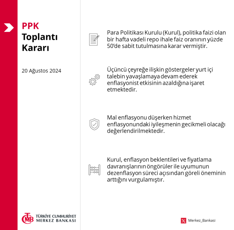 Merkez Bankası, politika faizini beklentiler dahilinde değiştirmeyerek yüzde 50 seviyesinde sabit tuttu.