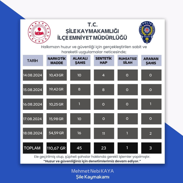 Şile İlçe sınırları dahilinde yaşanan yaz yoğunluğu ve nüfus artışı nedeniyle Şile Kaymakamlığına bağlı Polis ve Jandarma kuvvetlerinin kısa zaman içerisinde yaptığı çalışmalarda kamu düzeninin sağlanması ve suç ve suçlularla mücadele kapsamında İlçe Emniyet Müdürlüğü ve İlçe Jandarma Komutanlığı ekiplerinin çalışmaları hakkında Kaymakamlık Sosyal Medya Hesabında İlçe Kaymakamı Mehmet Nebi Kaya imzalı bilgilendirme paylaşıldı.