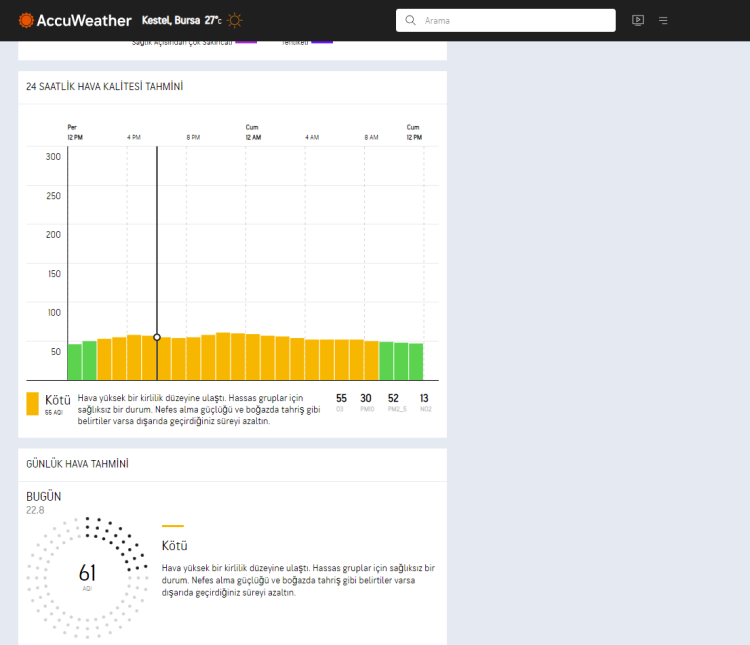 Accu Weather isimli Amerika menşeli şirketin resmi sitesinde Kestel’in hava kalitesi hakkında, havanın yüksek bir kirlilik düzeyine ulaştığı ve bu durumun hassas gruplar için risk barındırdığı ifade edildi. Ayrıca nefes alma güçlüğü olanlar için de ‘dışarıda geçirdikleri süreyi azaltmaları’ uyarısında bulunuldu.