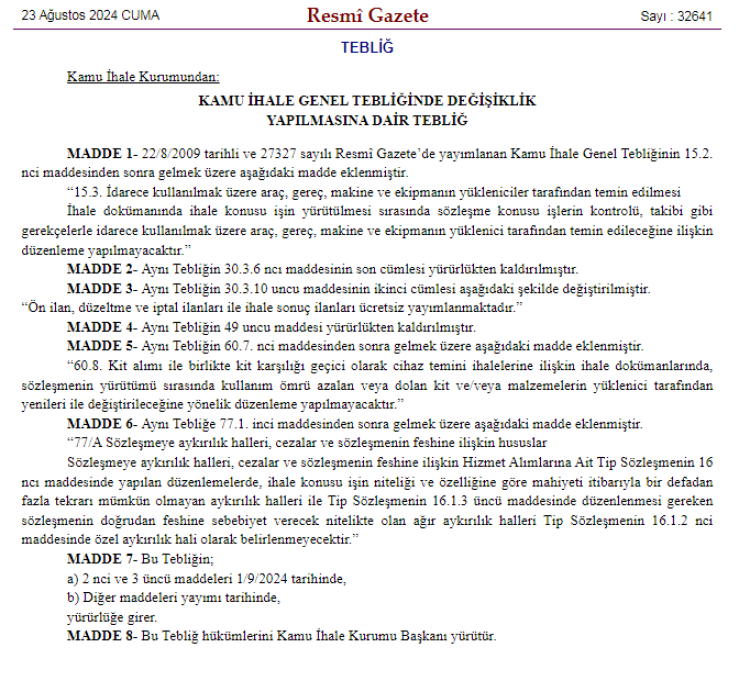 Ayrıca Kamu İhale Kurulu Kararı’na göre de Eylül 2024 ve sonrasında Kamu İhale Bülteni’nde yayımlanacak olan ve Kamu İhale Kanunu ile belirlenen bazı ihalelerin ilanları, Kurum’un ön kontrolüne tabi olacak ve bu ilanlardan ücret alınacak.
