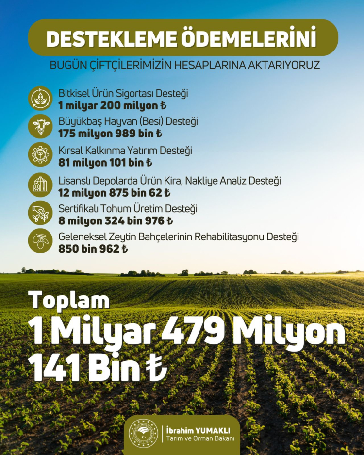 Tarım ve Orman Bakanı İbrahim Yumaklı, toplam 1 milyar 479 milyon 141 bin lira tarımsal destekleme ödemesini çiftçilerin hesaplarına aktaracaklarını duyurdu.