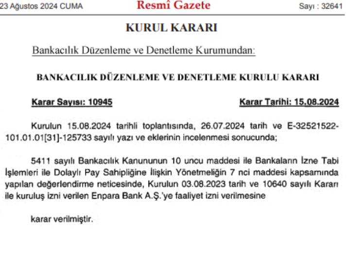Enpara Bank AŞ’ye faaliyet izni veren BDDK’nın kararı bugünkü Resmi Gazete’de yayımlandı. ANKARA (İGFA) – Bankacılık Düzenleme...