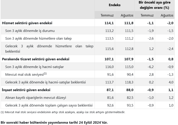 Buna göre mevsim etkilerinden arındırılmış güven endeksi Ağustos ayında bir önceki aya göre; hizmet sektöründe yüzde 2,0 oranında azalarak 111,8 değerini, perakende ticaret sektöründe yüzde 0,8 oranında artarak 107,9 değerini ve inşaat sektöründe yüzde 1,1 oranında artarak 88,0 değerini aldı.