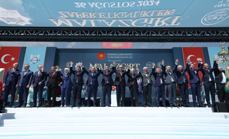 Cumhurbaşkanı Erdoğan, “Bir cuma sabahı, semaya karşı, Malazgirt’te 54 bin er, bestelediler en güzel marşı: Allahu ekber, Allahu ekber.” dizelerine atıfta bulunarak “Bu mısralara ilham veren o günkü imanla o günkü cesaretle o günkü adanmışlıkla bugün yine Malazgirt’teyiz.” dedi.