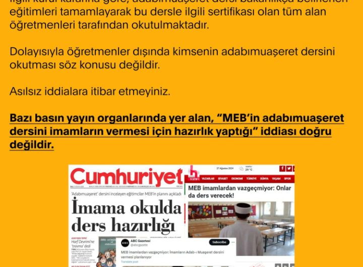 Bazı basın yayın organlarında yer alan “MEB’in adabımuaşeret dersini imamların vermesi için hazırlık yaptığı” iddiası doğru olmadığı...