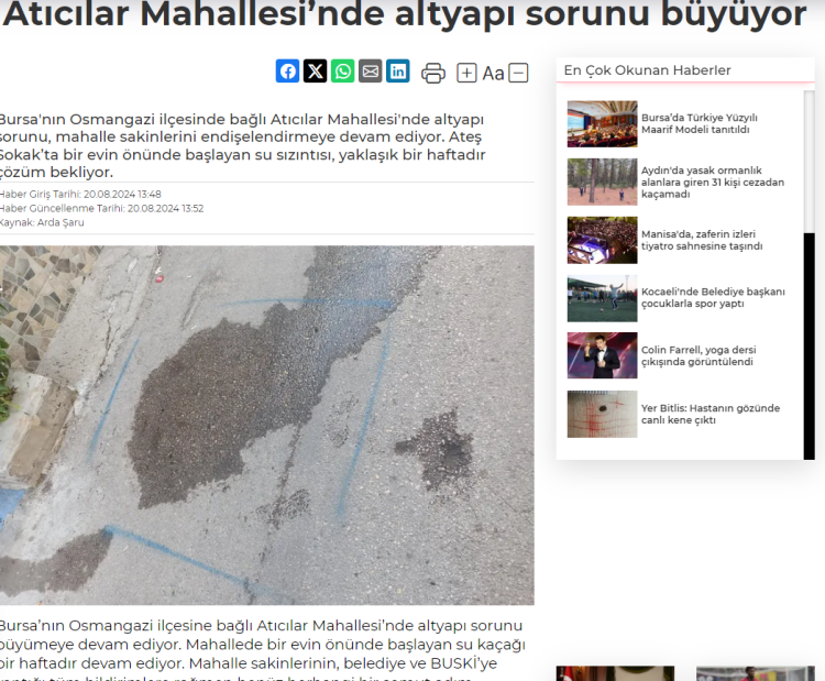 Öncesinde bir hafta boyunca yapılması beklenen ama çalışma yapılmayan sorun için haberimizi paylaşmıştık. Üzerinden 11 gün geçti ve son 11 gün boyunca herhangi bir ilerleme kaydedilmediği belirtilirken, Atıcılar Mahallesi sakinleri, yetkililere acil müdahale çağrısında bulunuyor. Su sızıntısının giderek büyümesi ve daha büyük altyapı sorunlarına yol açması ihtimali, mahalle halkını endişelendiriyor.