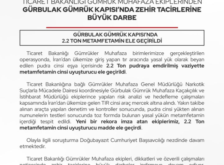 Ticaret Bakanlığı Gümrük Muhafaza ekipleri Gürbulak Gümrük Kapısı’nda zehir tacirlerine büyük darbe vurdu. Yeni bir rekora imza...