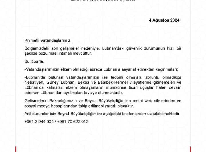 Dışişleri Bakanlığı, Lübnan’a seyahat etmekten kaçınmaları ve hali hazırda Lübnan’da bulunan vatandaşların mümkünse ülkeden ayrılmalarını tavsiye etti....