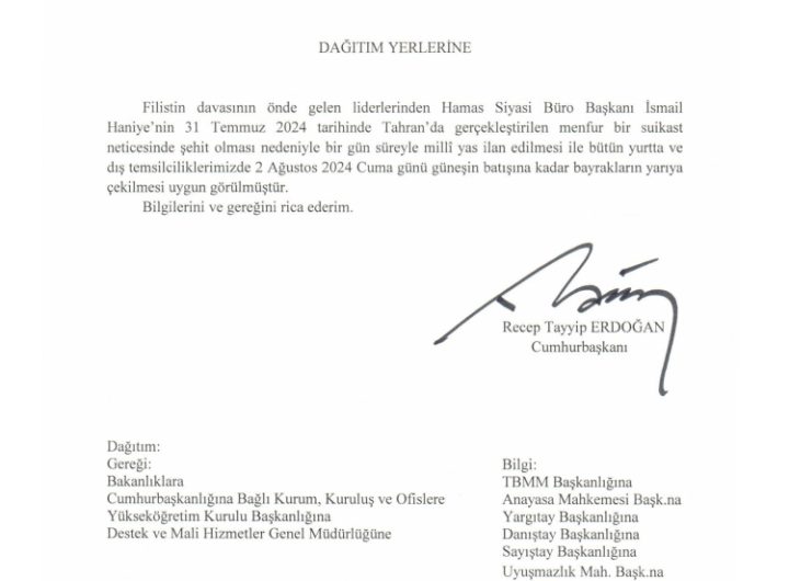 Cumhurbaşkanı Recep Tayyip Erdoğan, Hamas Siyasi Büro Başkanı İsmail Heniyye’nin şehadeti sebebiyle 2 Ağustos Cuma günü bir...