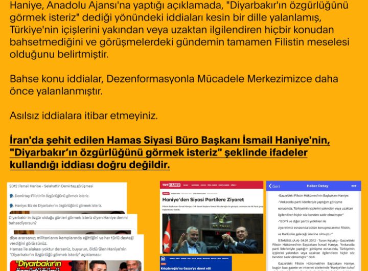 İletişim Başkanlığı, İran’da şehit edilen Hamas Siyasi Büro Başkanı İsmail Haniye’nin, “Diyarbakır’ın özgürlüğünü görmek isteriz” şeklinde ifadeler...