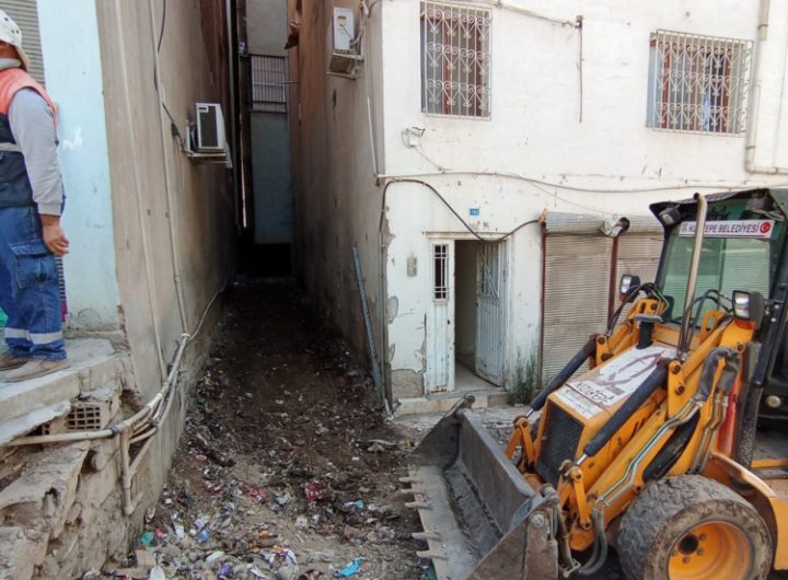 Şahkulubey Caddesi üzerinde yer alan iki apartmanın boşluğuna atılan çöpleri iş makineleriyle temizleyen Kızıltepe Belediyesi ekipleri, apartman...
