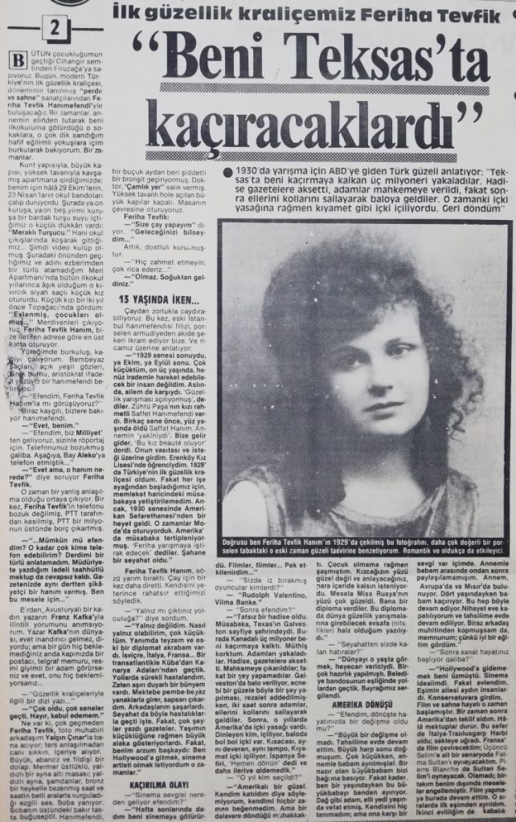 Bu yarışmadan birkaç yıl sonra, 1929’da Cumhuriyet Gazetesinde ufak bir ilan yayınlanmıştı: “Türkiye’nin en güzel kadınını arıyoruz, güzellik kraliçesi seçilecek…”Feriha Tevfik, o zamanlar 13 yaşında genç bir kız ve tek bir hayali var: Amerika’ya gitmek ve orada film yıldızı olmak. Üstelik bu hayalini gerçekleştirmek için de Amerika’daki bir film şirketine mektup yazmış ve olumlu geri dönüş almıştı. Fakat yaşının küçük olmasından ötürü birkaç yıl beklemesinin daha iyi olacağı da aynı mektupta kendisine bildirilmişti. O da, bu sürede kendisini geliştirerek Amerika’ya olabildiğince hazır şekilde gitmenin planlarını yapmaktaydı. Aklında yarışmaya dair hiçbir düşünce olmayan genç Feriha’yı, evlerine misafir gelen eski Roma Büyükelçisi Kazım Bey’in kızı Saffet Hanım beğenip, hem kendisini hem de annesini ikna etmişti.