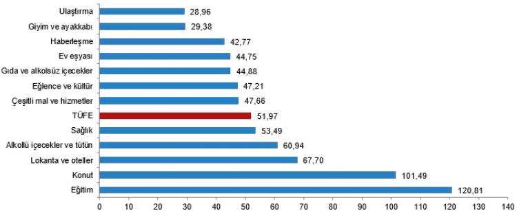 Bir önceki yılın aynı ayına göre en az artış gösteren ana grup yüzde 28,96 ile ulaştırma oldu. Buna karşılık, bir önceki yılın aynı ayına göre artışın en yüksek olduğu ana grup ise yüzde 120,81 ile eğitim oldu.