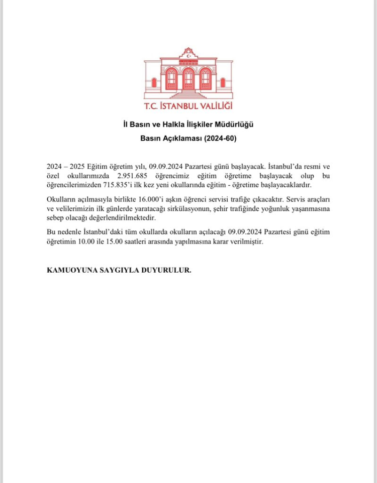 Açıklamada, “Okulların açılmasıyla birlikte 16 bini aşkın öğrenci servisi trafiğe çıkacaktır. Servis araçları ve velilerimizin ilk günlerde yaratacağı sirkülasyonun, şehir trafiğinde yoğunluk yaşanmasına sebep olacağı değerlendirilmektedir. Bu nedenle İstanbul’daki tüm okullarda, okulların açılacağı 9 Eylül Pazartesi günü eğitim öğretimin 10.00 ile 15.00 saatleri arasında yapılmasına karar verilmiştir.” ifadeleri yer aldı.