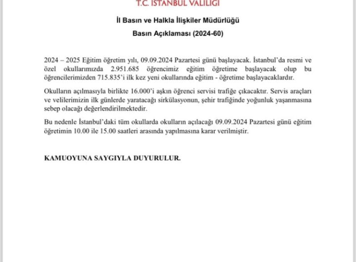 İstanbul Valiliği, il genelindeki tüm okullarda okulların açılacağı 9 Eylül Pazartesi günü trafik yoğunluğuna karşı eğitim öğretimin...