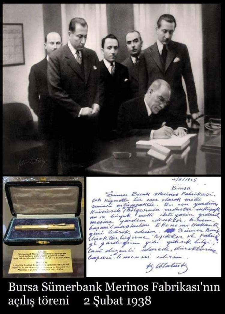 “Sümer Bank Merinos Fabrikası, çok kıymetli bir eser olarak milli sevinci arttıracaktır. Bu eser yurdun, hususiyle Bursa bölgesinin endüstri inkişafına (gelişimine) ve büyük milli ihtiyacın giderilmesine yardım edecektir. Eserin başarılmasından Ekonomi Bakanlığını tebrik ederim. Sümer Bank Direktörlüğüne teşekkür ve fabrikayı gördüğüm gibi yüksek bilgi ve tam düzenli idarede direktörüne başarılar temenni ederim.”
