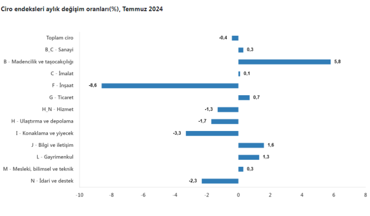 Sanayi, inşaat, ticaret ve hizmet sektörleri toplamında ciro endeksi 2024 yılı Temmuz ayında yıllık yüzde 39,8 arttı....
