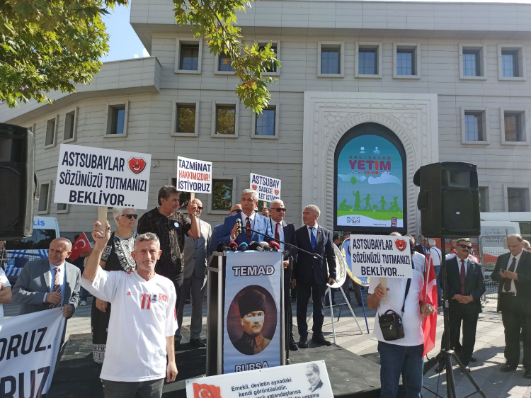 Bugün Türkiye Emekli Astsubaylar Derneği (TEMAD) Bursa İl Başkanlığı, Fomara (15 Temmuz) Meydanı’nda astsubay tazminat haklarıyla ilgili bir basın açıklaması düzenledi. Etkinlik, saygı duruşu ve İstiklal Marşı’nın okunmasıyla başladı.