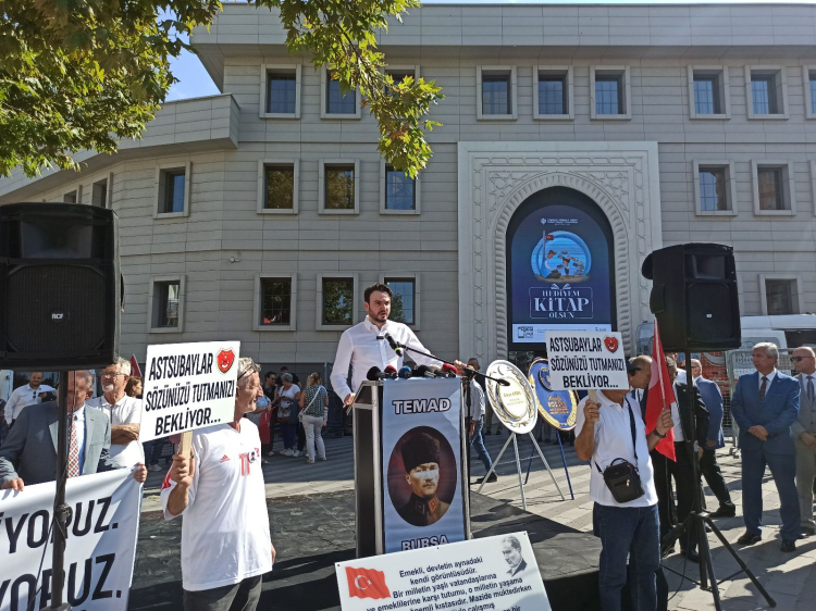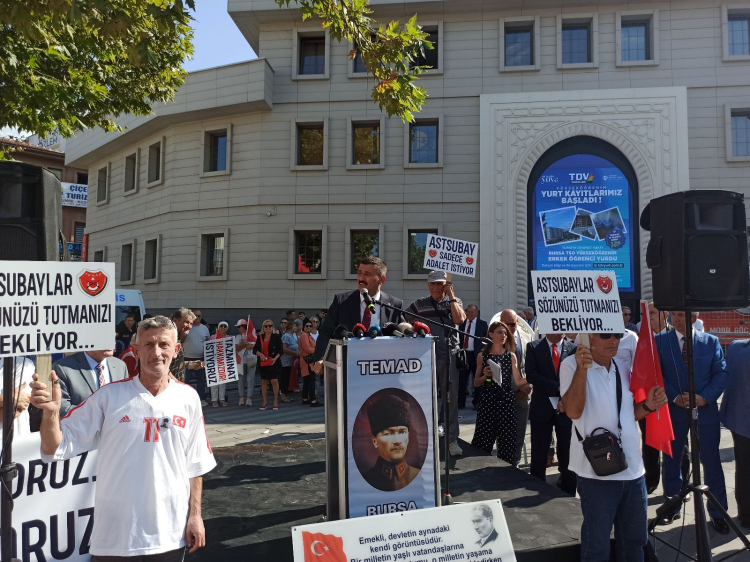 Bugün Türkiye Emekli Astsubaylar Derneği (TEMAD) Bursa İl Başkanlığı, Fomara (15 Temmuz) Meydanı’nda astsubay tazminat haklarıyla ilgili bir basın açıklaması düzenledi. Etkinlik, saygı duruşu ve İstiklal Marşı’nın okunmasıyla başladı.