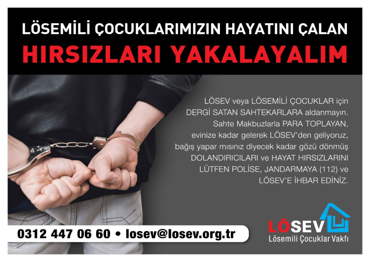 LÖSEV’den yapılan yazılı açıklamada, “LÖSEV adına gazete sattığını, bağış topladıklarını belirten kişiler kapı kapı geziyor. Neredeyse bizden iyi çalışıyorlar. Yaptıkları iş hem itibarımıza zedeliyor hem de lösemili çocuklarımızın hakkına giriyor. Bu tarz durumlarda hemen 112 polis imdat ve 0312 447 06 60 LÖSEV telefonlarına ihbar edin. Konuyla alakalı araştırmalar yapıldıktan sonra hukuki yollara anında başvurulacak ve gerekli işlemler başlatılacaktır” ifadeleri yer aldı.