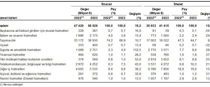 Hizmet ihracatı 2023 yılında 56,5 milyar dolar, ithalat ise 41,4 milyar dolar olarak gerçekleşti. Hizmet ithalatında taşımacılık...