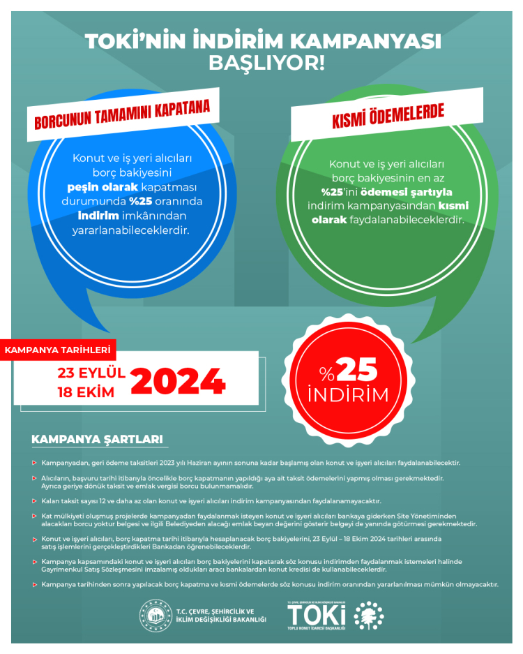 TOKİ, vatandaşlardan gelen yoğun talep üzerine geri ödemeleri devam eden konut ve iş yerleri için ‘Yüzde 25 İndirim Kampanyası’ düzenlediğini duyurdu. 23 Eylül’de başlayacak TOKİ’nin indirim kampanyası 18 Ekim’e kadar sürecek.